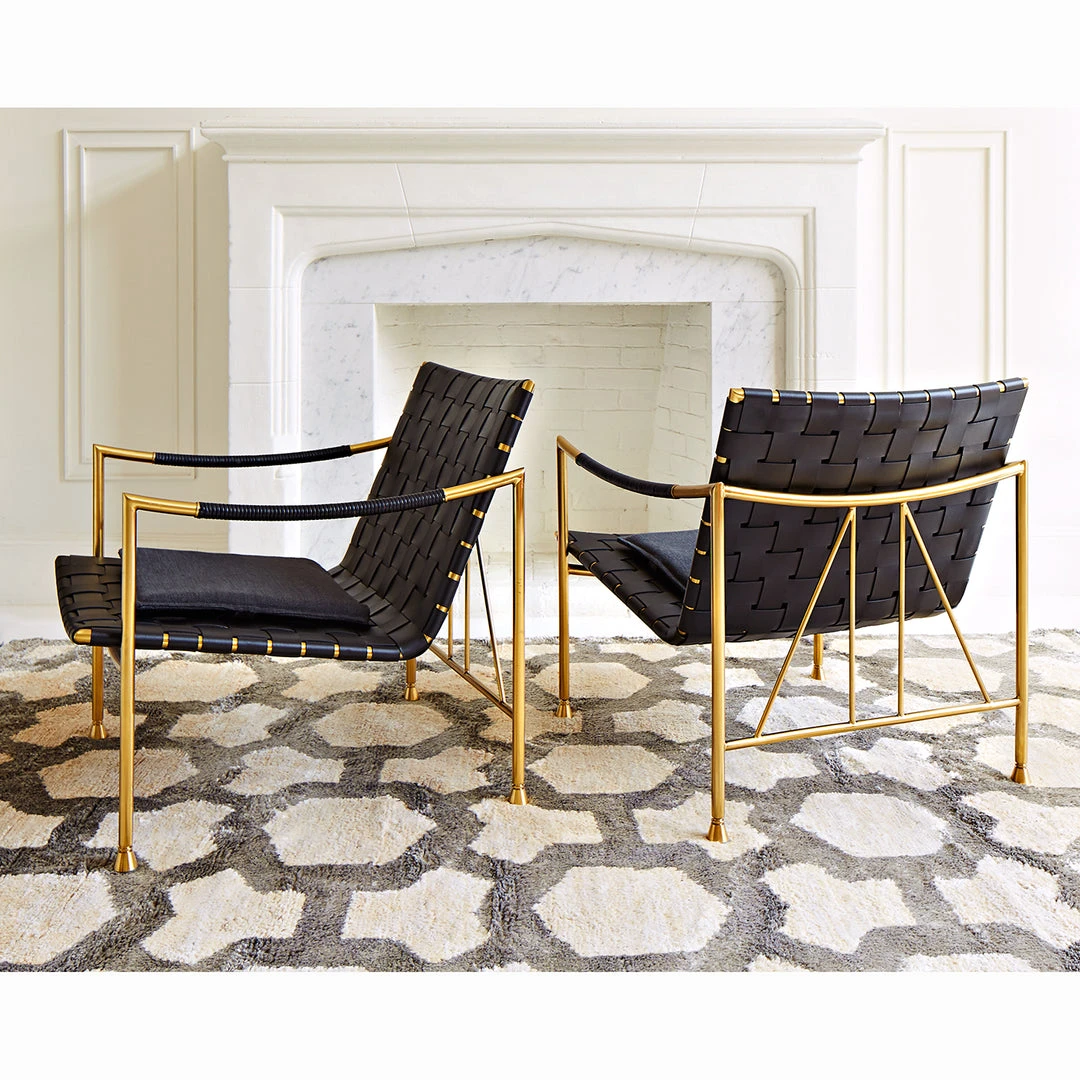 Inspired by Thebes stools, beloved by everyone from Egyptian pharaohs to Liberty of London, our Thebes Lounge Chair is a modern take on a decorating classic. An architectural brass frame with signature Thebes spokes supports an expertly pitched and spacious seat woven from strips of hardworking black leather and topped with a removable cushion. The swooping armrest is wrapped in black leather cord for added softness and style. This handsome seat is modern enough for a Mies van der Rohe pavilion but swanky enough for a Parisian chateau.