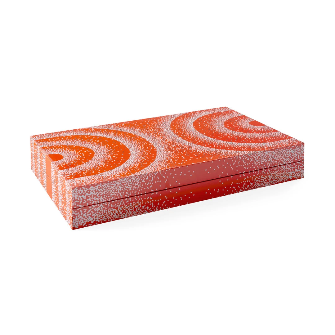 Inspired by 30s Art Deco airbrushing, our Vapor patterns strike the perfect balance between timeless and today, Deco elegance, and a wink of 1980s style. Crafted in couture lacquer, our Vapor Backgammon Set is the splash of shape and color your game night needs. After vanquishing your foes, fold it closed for a cool cocktail table accent.