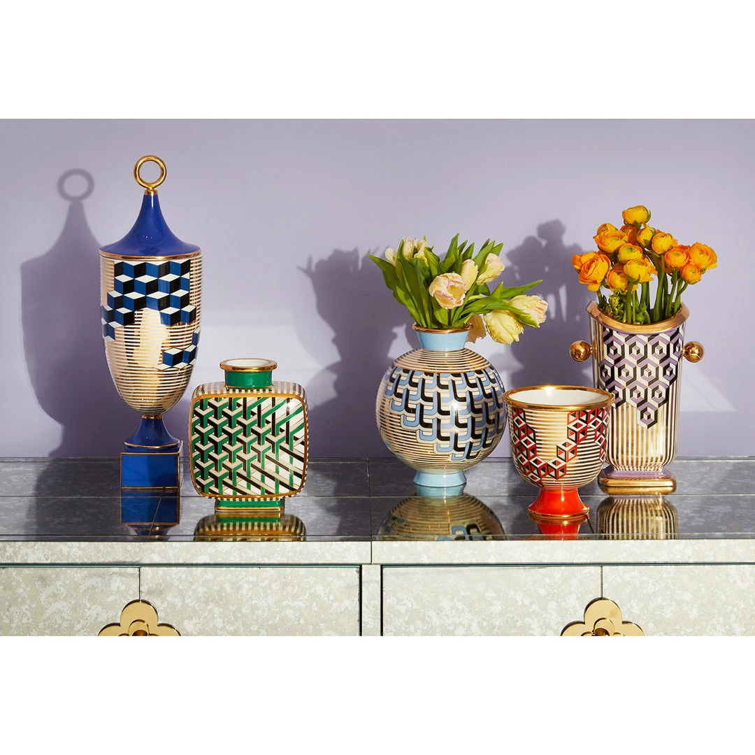 Featuring signature patterns dynamically deconstructed for a 21st century twist, our classic-meets-cutting edge collection treats graphic greatness to gobs of gold. Our Versailles Hex Vase is fab flanking a fireplace, a stand-out in your tablescape, or style all of our Versailles vessels together for a fresh and futuristic spin on formal décor.